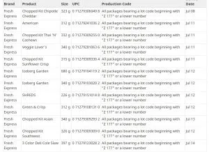 A list of Fresh Express salads under recall. Image c/o CFIA.