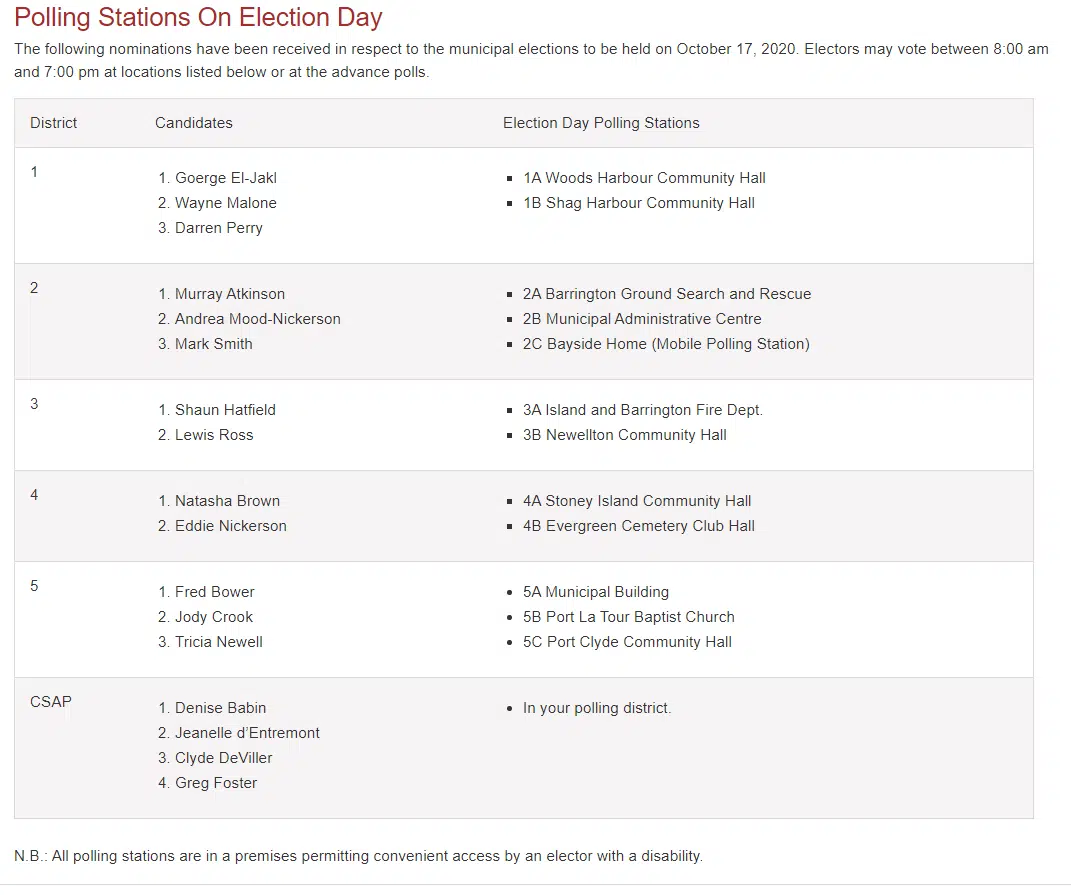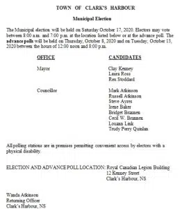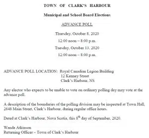 In the Town of Clark’s Harbour, in-person advance polling is being held Thursday, October 8th and Monday, October 13th from 12:00 noon until 8:00 p.m. at the Royal Canadian Legion on Kenney Street.