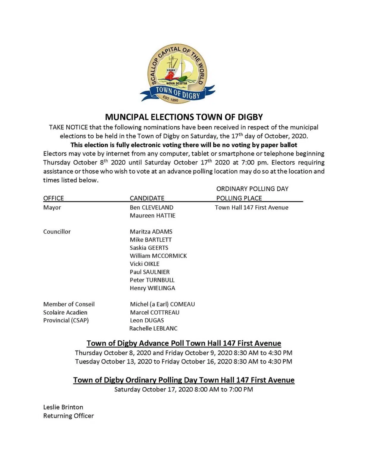In the Town of Digby, evoting also begins on Thursday.