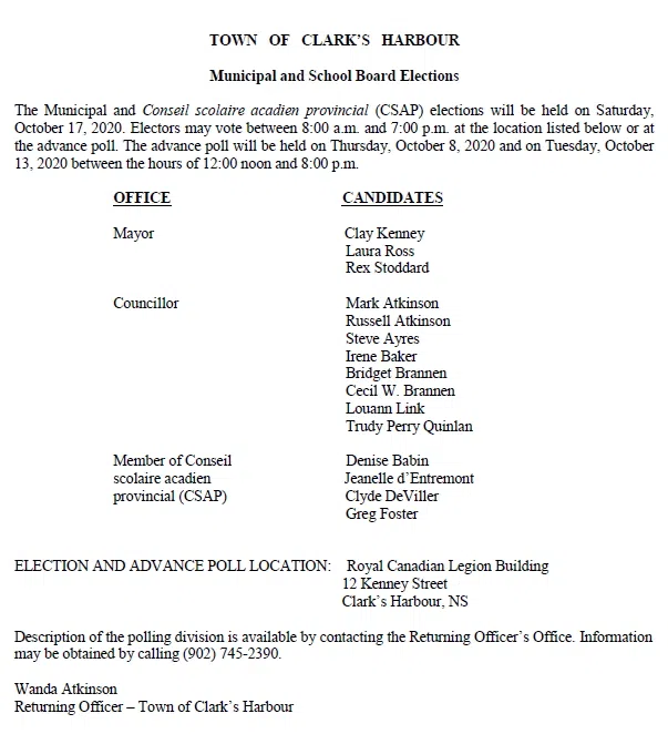 In the Town of Clark’s Harbour, in-person advance polling is being held Thursday, October 8th and Monday, October 13th from 12:00 noon until 8:00 p.m. at the Royal Canadian Legion on Kenney Street.