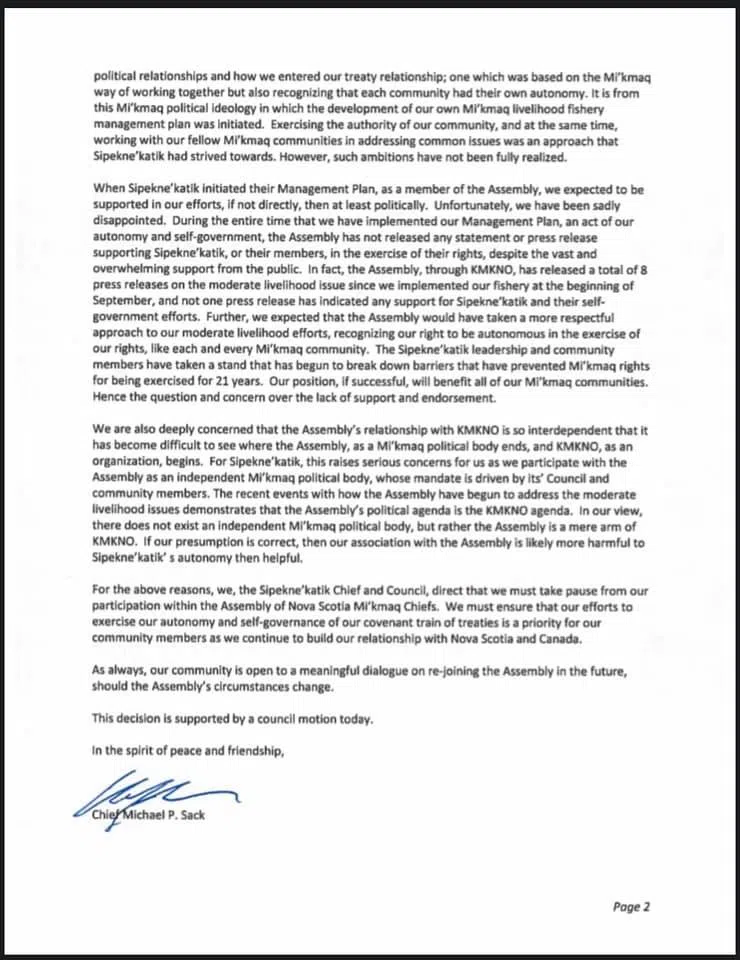 In a letter sent to the Assembly of Nova Scotia Mi’kmaw Chiefs on Tuesday, Chief Mike Sack stated that the First Nation has withdrawn from the Kwilmu’kw Maw-klusuaqn Negotiation Office, or KMKNO.