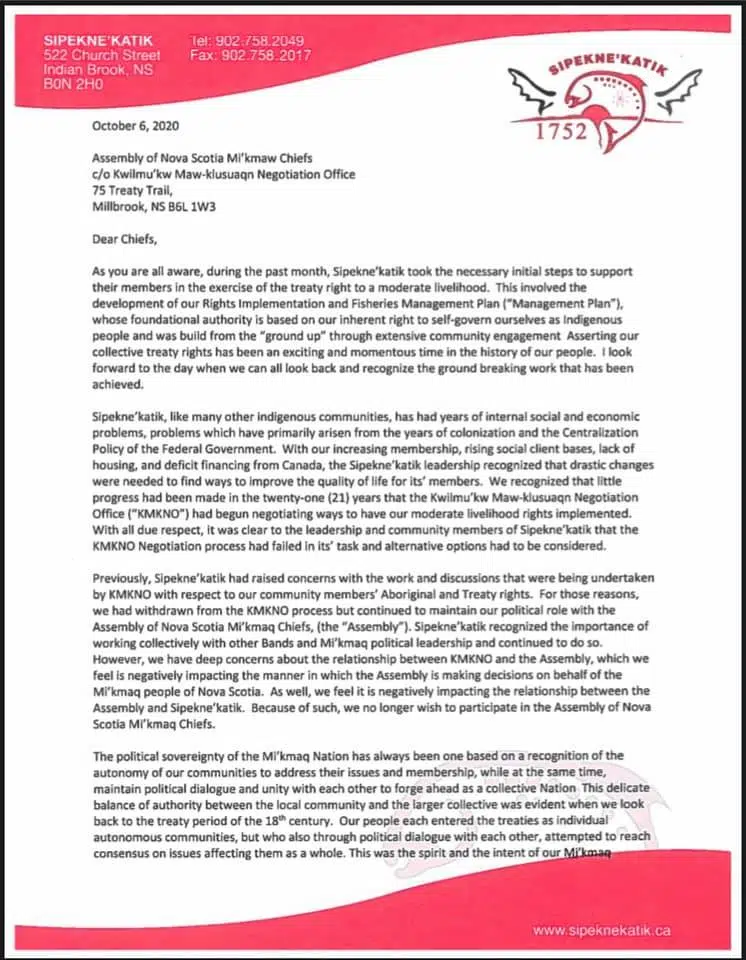 He noted in the letter that negotiations via KMKNO have yielded little progress over the past 21 years, and the Sipekne’katik First Nation is facing mounting issues surrounding increasing membership, a lack of housing, and deficit financing that demands drastic changes.