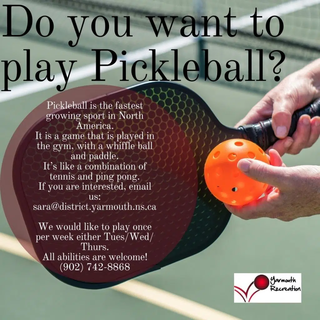 If you’re interested in playing Pickleball, even if you’ve never done it before, you can email: sara@district.yarmouth.ns.ca