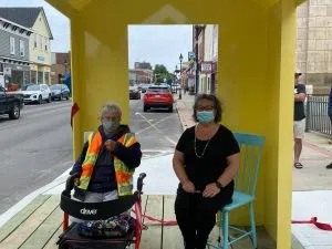 Margaret Surette and Mayor Pam Mood seated on the kitchen party chairs in the lobster car bus shelter.