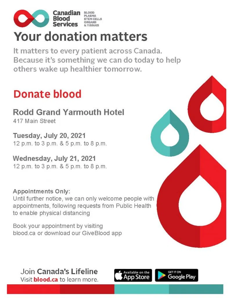 “We’re at the Rodd Grand Hotel. We have about 50 appointments that are available. We encourage everyone to download the ‘Give Blood’ app, visit blood.ca or call 1-888-2DONATE to make an appointment.”