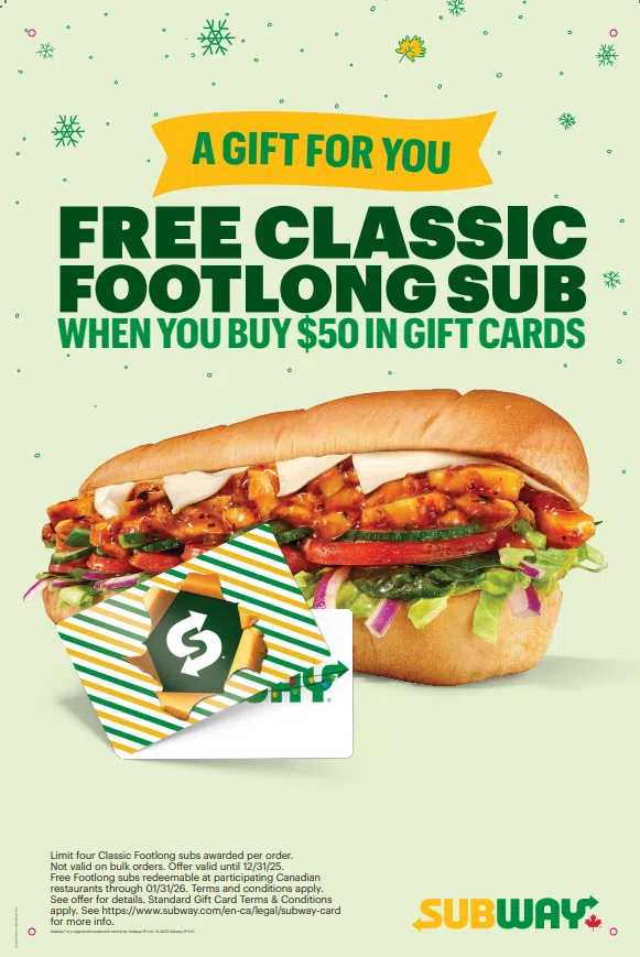When you purchase a $50 Subway Gift Card, you’ll receive a FREE Footlong just for you.