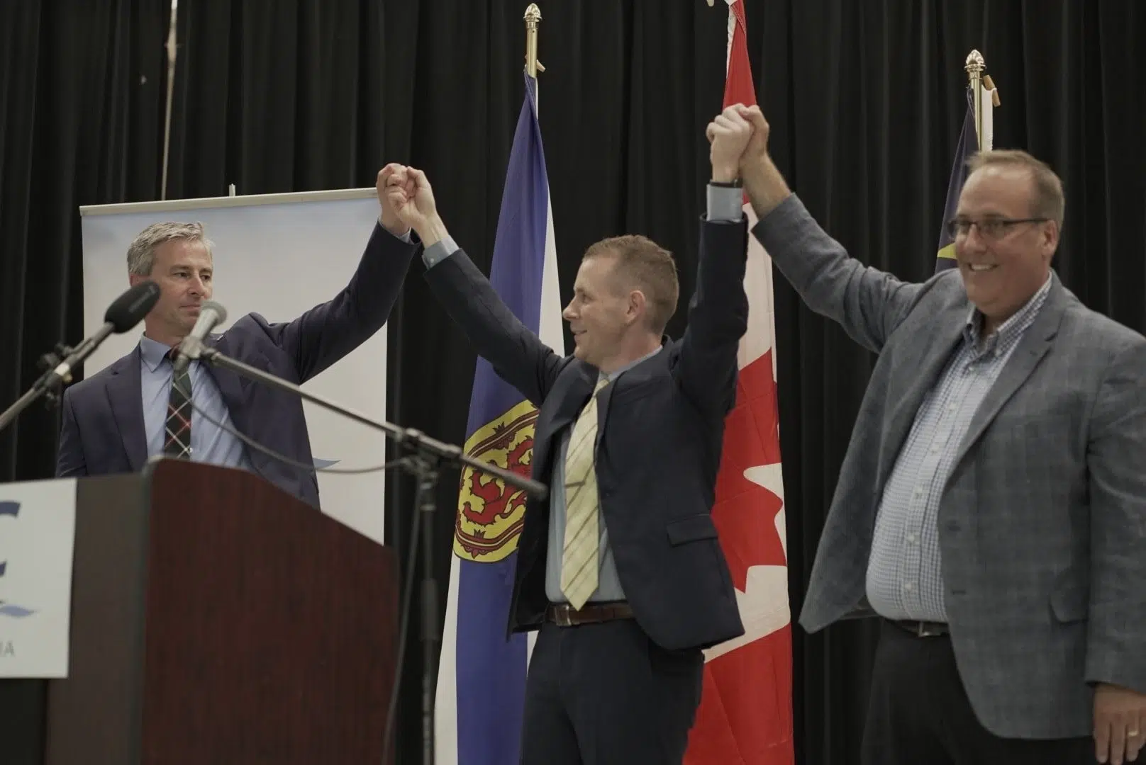 (PC Leader Tim Houston (L), Colton LeBlanc and Chris d’Entremont, the current MLA. -photo-Facebook)