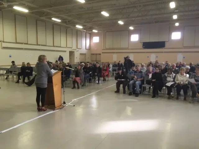 (Mayor Karen Mattatal addresses yesterday’s meeting-Acadia News photo) About 115 people attending a health care meeting in Shelburne yesterday. It was organized in response to the on-going closu...