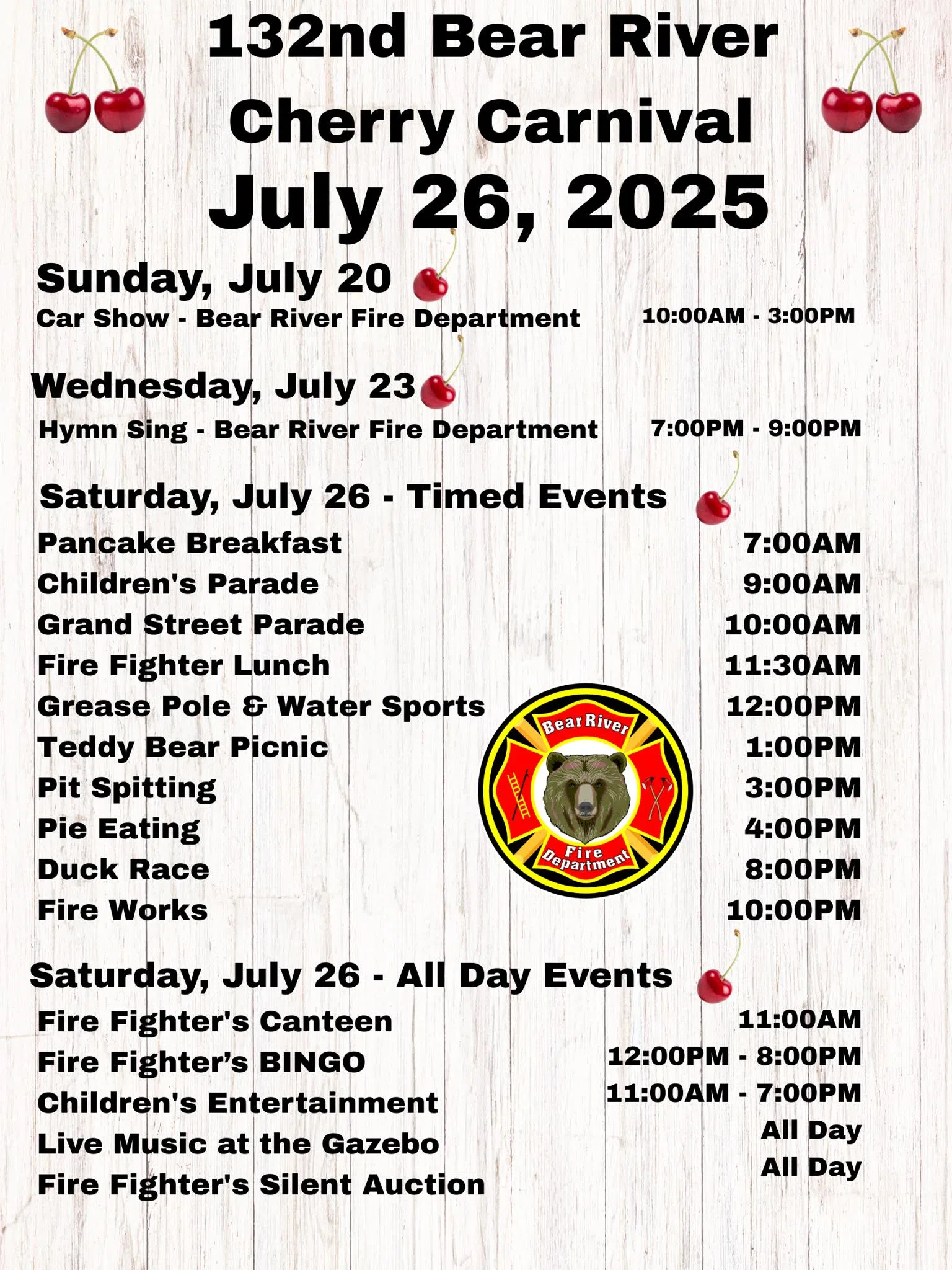 Mark your calendars and come to Bear River on July 26th for the 132nd Bear River Cherry Carnival!