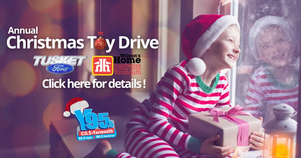 Now until December 12th, drop off your unwrapped, new toy at either Tusket Ford, at Wilsons Home Hardware or in our big bin at our studios at 328 Main Street in Yarmouth.